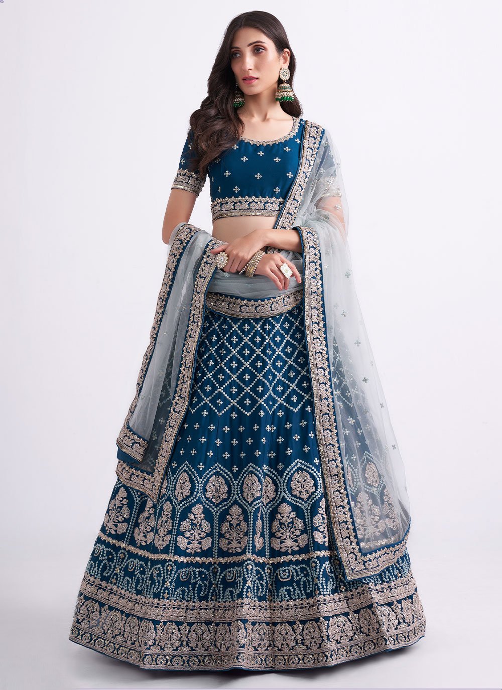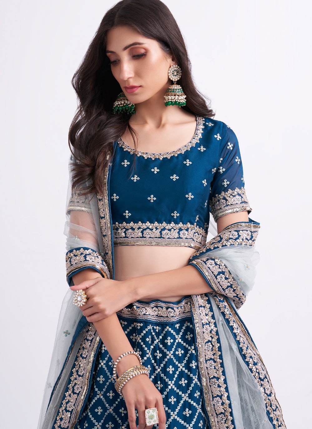 Designed with simplicity with a touch of soberness in its work makes a masterpiece. Be the sunshine of everyone’s eyes dressed in this beautiful blue georgette lehenga choli. Look ravishing clad in this attire which is enhanced cord, embroidered, sequins and thread work. Comes with matching choli and dupatta. (Slight variation in color, fabric & work is possible. Model images are only representative.)