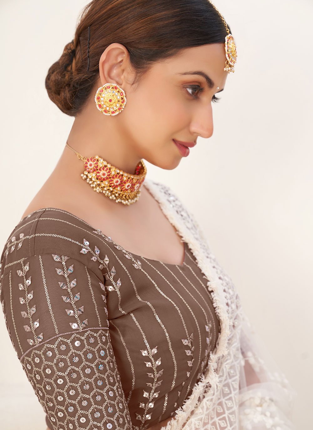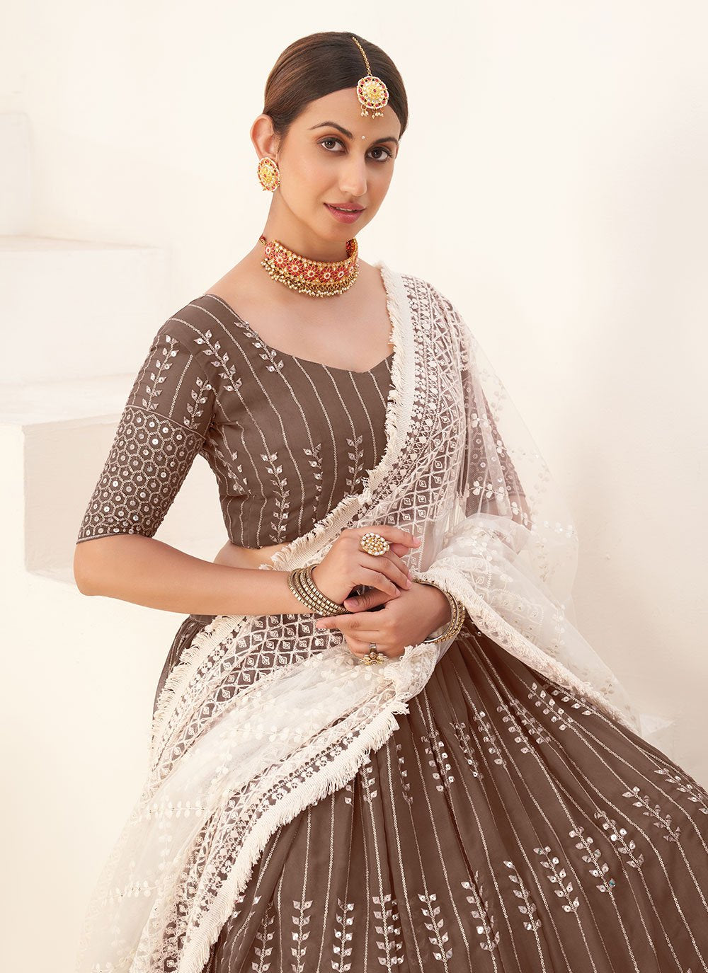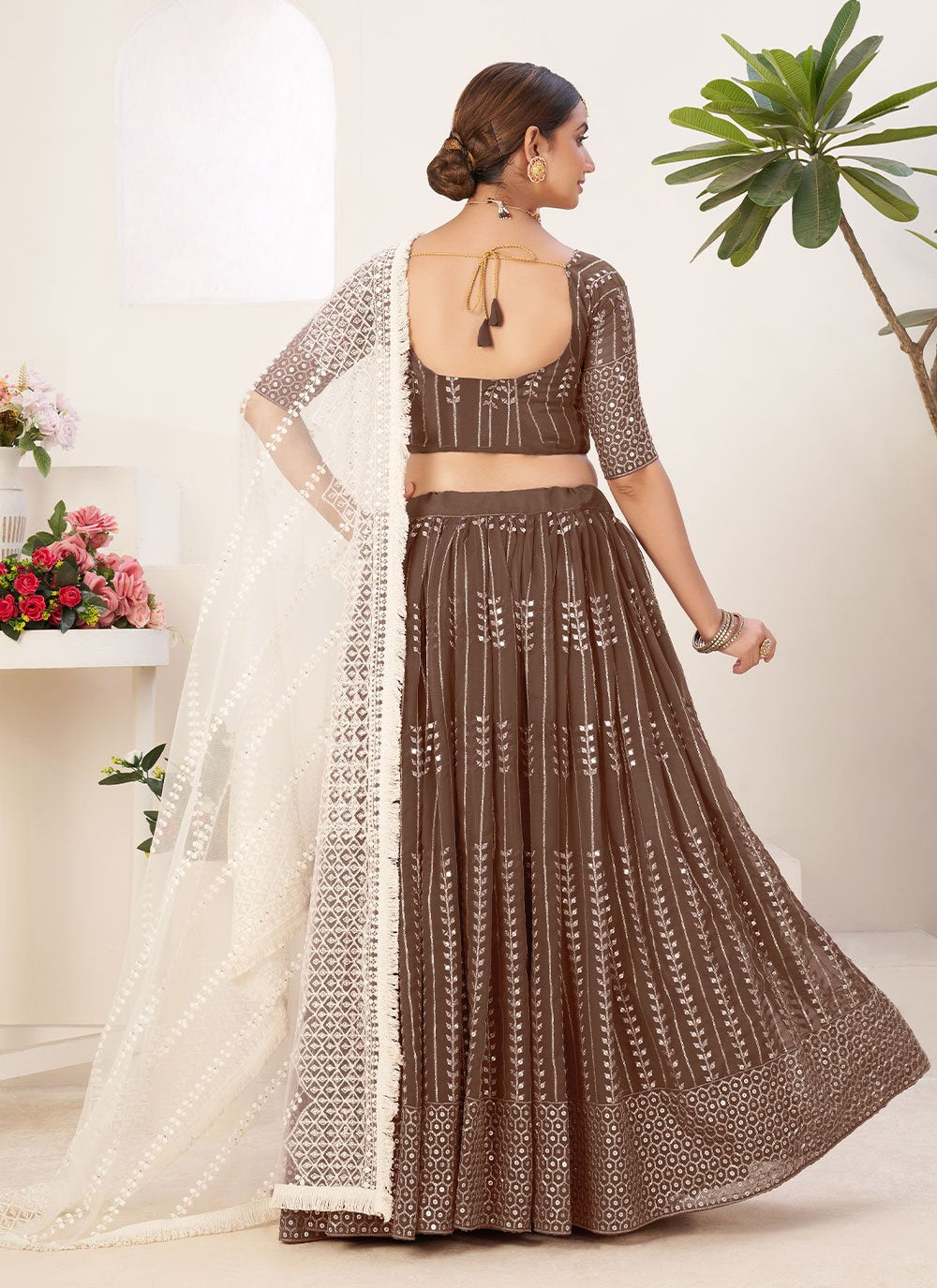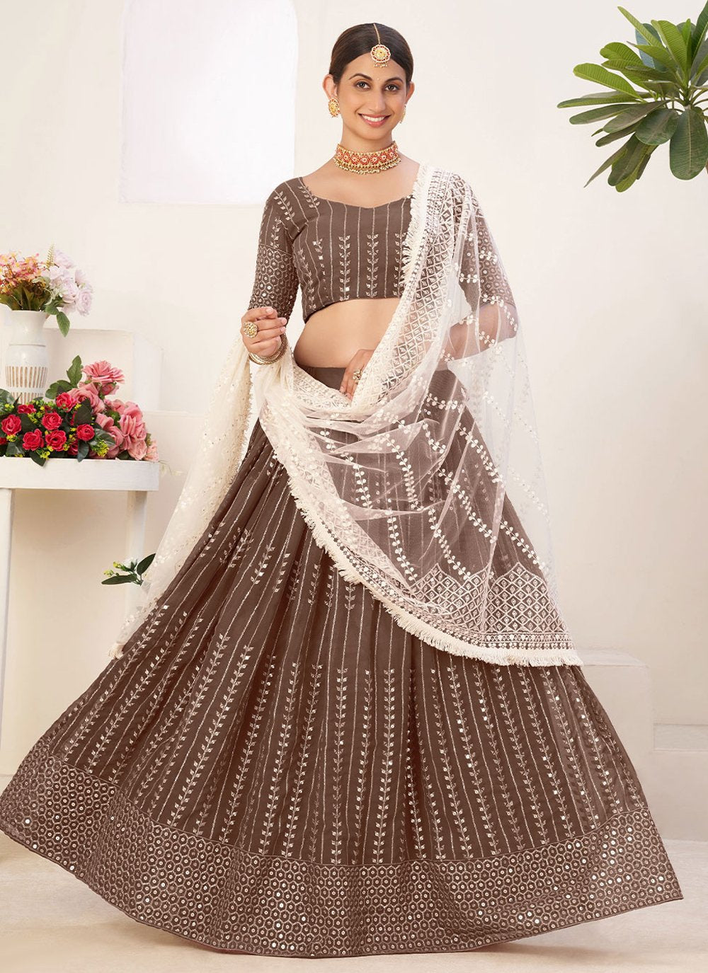 Famous designers tend to give reign to their imagination and create clothes that look interesting and guided by the desire to attract attention. Steal the hearts away with this brown georgette trendy lehenga choli. It has been beautifully designed with embroidered and sequins work. Comes with matching choli and dupatta. (Slight variation in color, fabric & work is possible. Model images are only representative.)