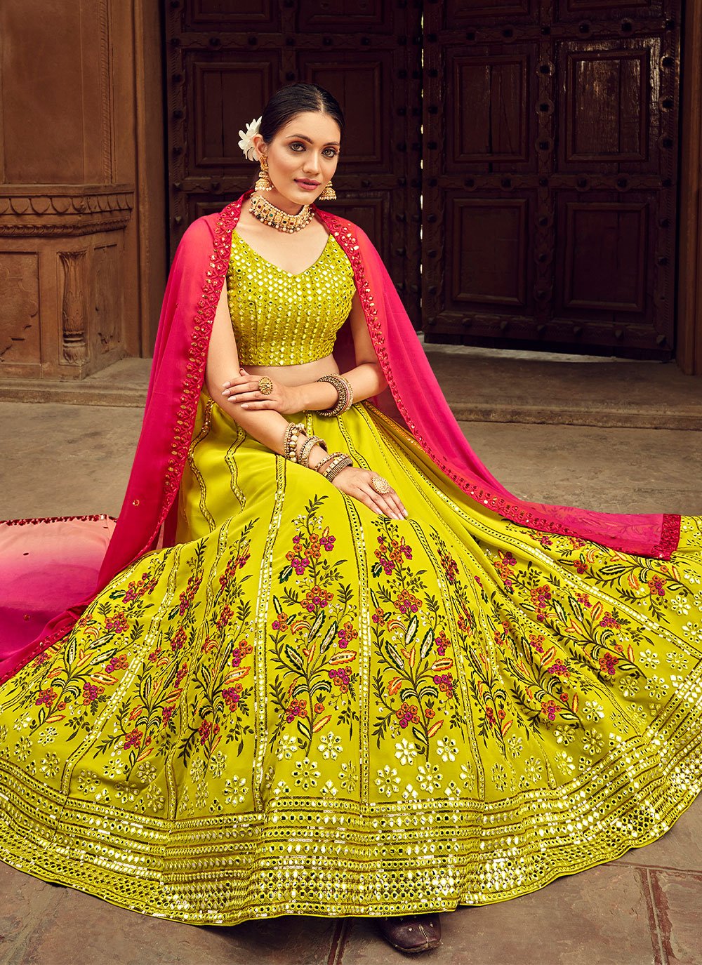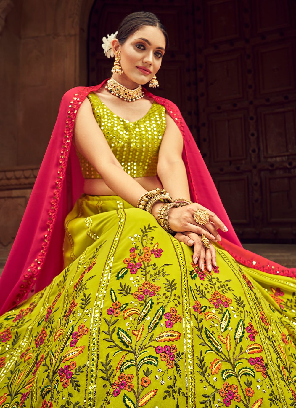 This brilliant array will make you the ultimate classic beauty at the next event you attend. This green georgette lehenga choli is including the wonderful glamorous showing the sense of cute and graceful. The ethnic embroidered, sequins and thread work for the attire adds a sign of magnificence statement with your look. Comes with matching choli and dupatta. (Slight variation in color, fabric & work is possible. Model images are only representative.)