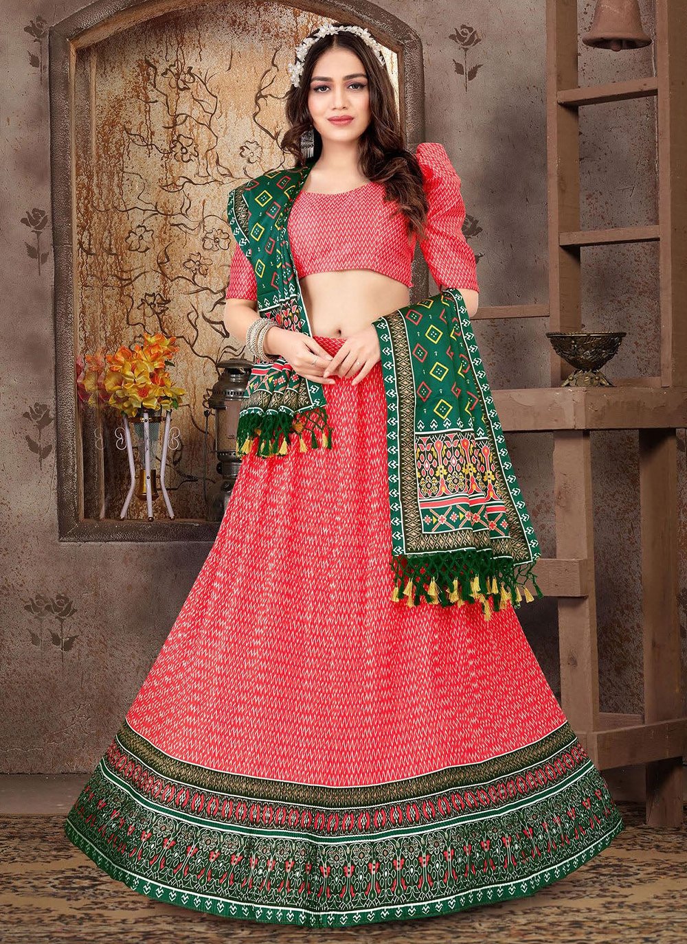 We are to breathe life into your aspirations and to make a mark in the world of style. Be your own style diva with this red satin silk lehenga choli. Beautified with print work all synchronized well with the pattern and design of the attire. Comes with matching choli and dupatta. (Slight variation in color, fabric & work is possible. Model images are only representative.)