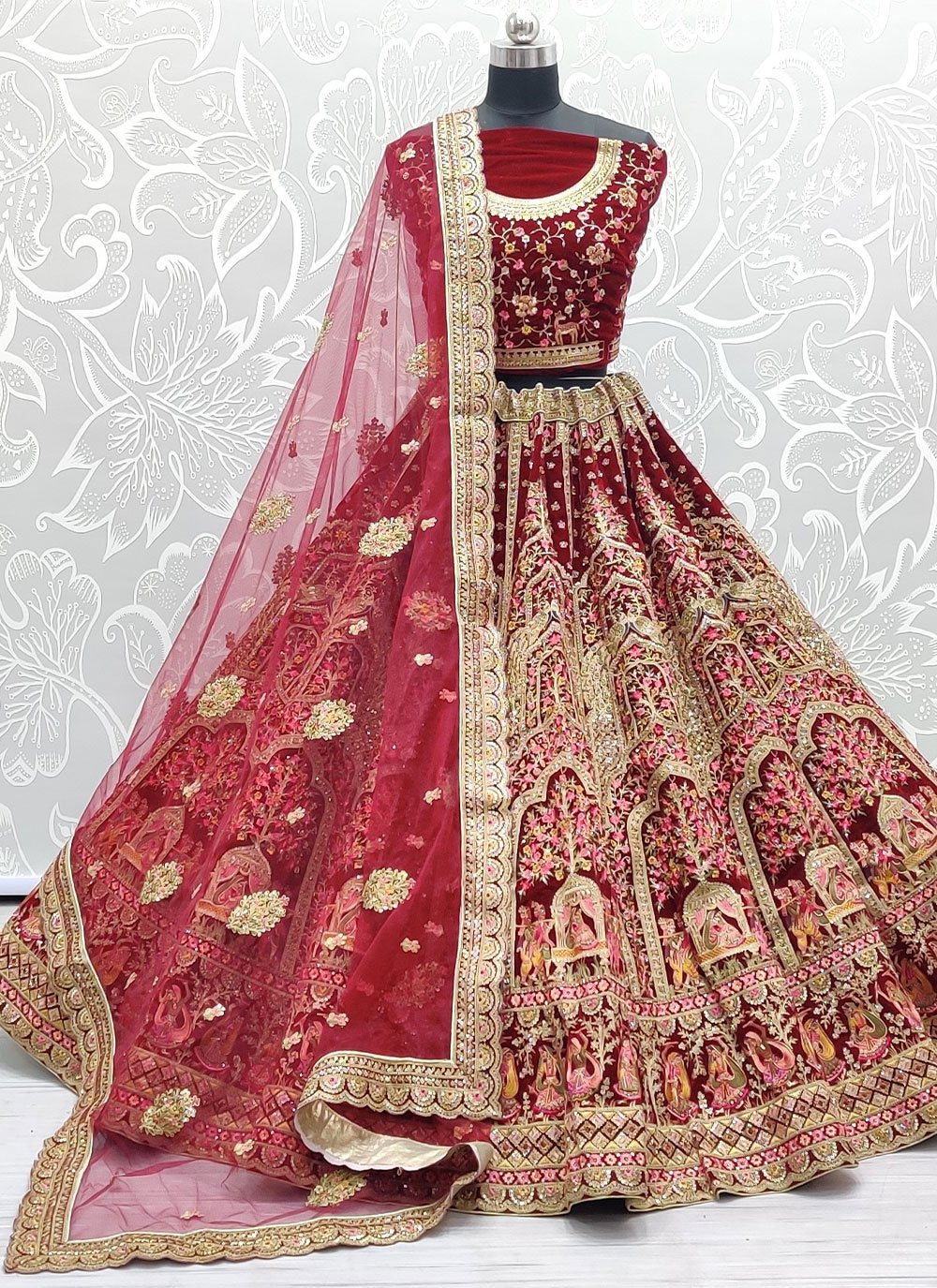 This delightful diva accoutre features unique styling and unusual material. Spread the aura of freshness with this maroon velvet designer lehenga choli showing a touch of sensuality. You can see some fascinating patterns done with sequins and zari work. Comes with matching choli and dupatta. (Slight variation in color, fabric & work is possible. Model images are only representative.)