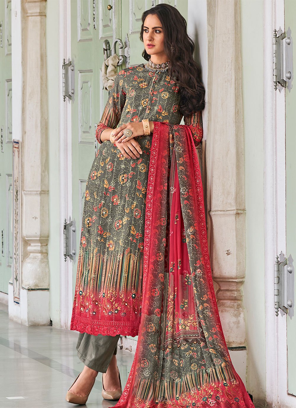 Appear stunningly appealing in such a multi colour muslin pakistani salwar suit. You are able to see some fascinating patterns performed with embroidered and floral print work. Comes with matching bottom and dupatta. (Slight variation in color, fabric & work is possible. Model images are only representative.) Maximum possible bust size: 42 inches.