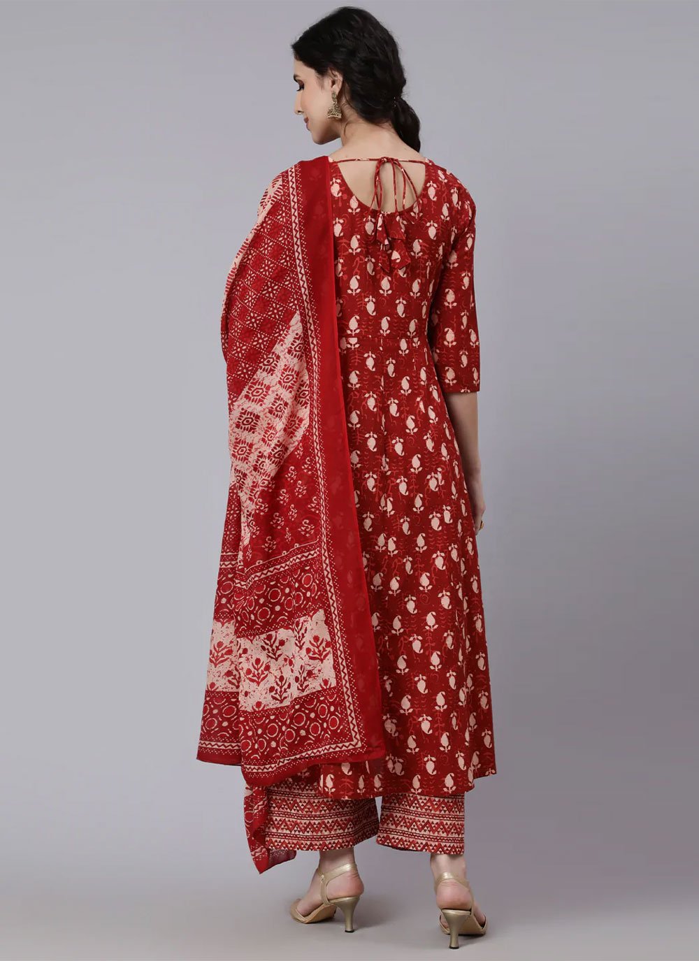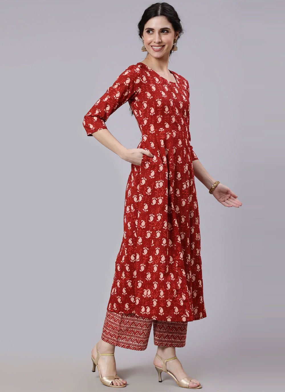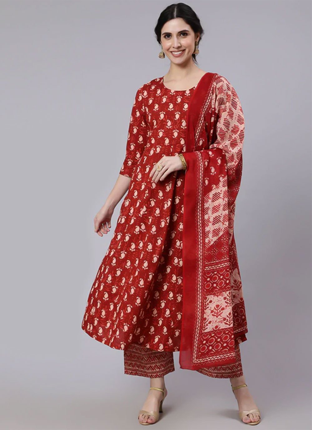 Be the center of attraction with this red cotton palazzo salwar suit. You can see some fascinating patterns done with printed work. Comes with matching bottom and dupatta. (Slight variation in color, fabric & work is possible. Model images are only representative.) Maximum possible bust size: 42 inches.