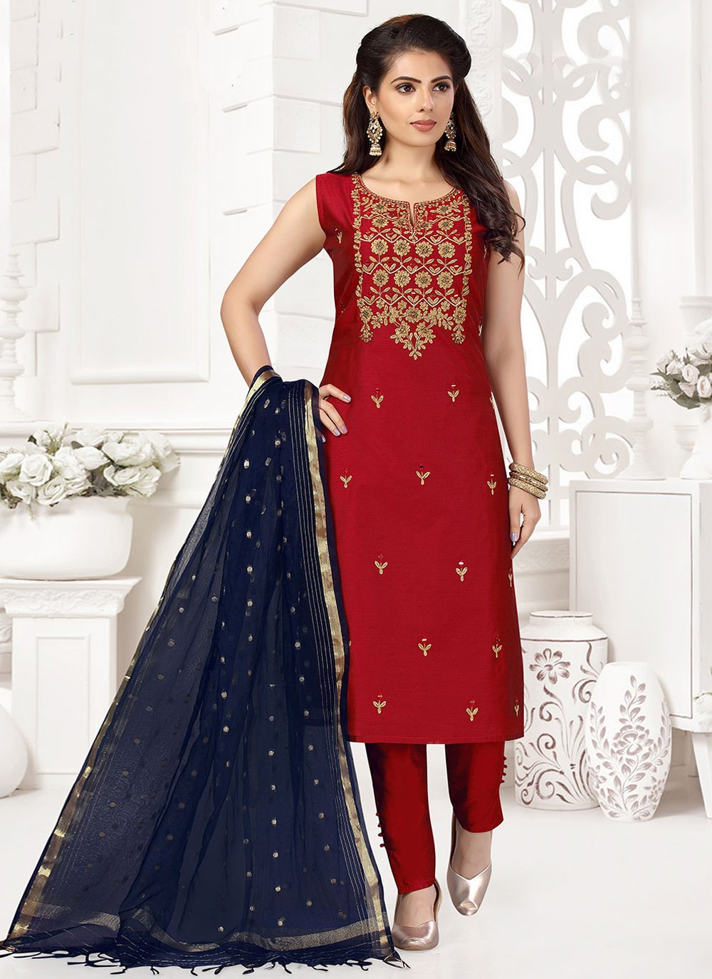 Pant Style Suit Chanderi Red Embroidered Salwar Kameez
