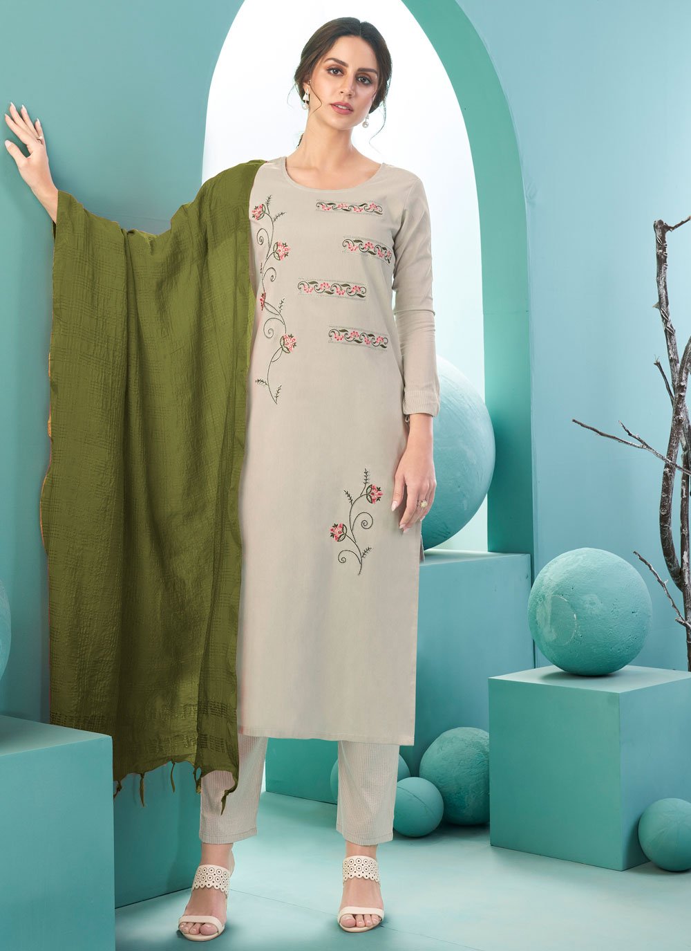 Include yourself in a glamour of a season with this beige cotton pant style suit. The fantastic attire creates a dramatic canvas with unbelievable embroidered work. Comes with matching bottom and dupatta. (Slight variation in color, fabric & work is possible. Model images are only representative.) Maximum possible bust size: 42 inches.