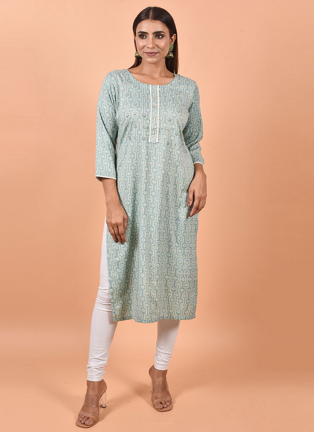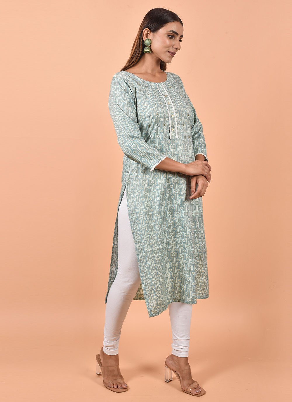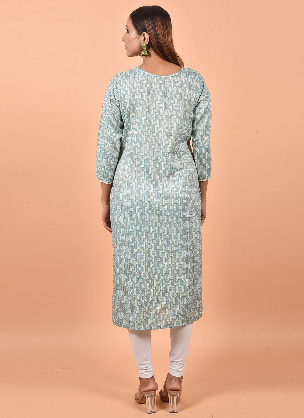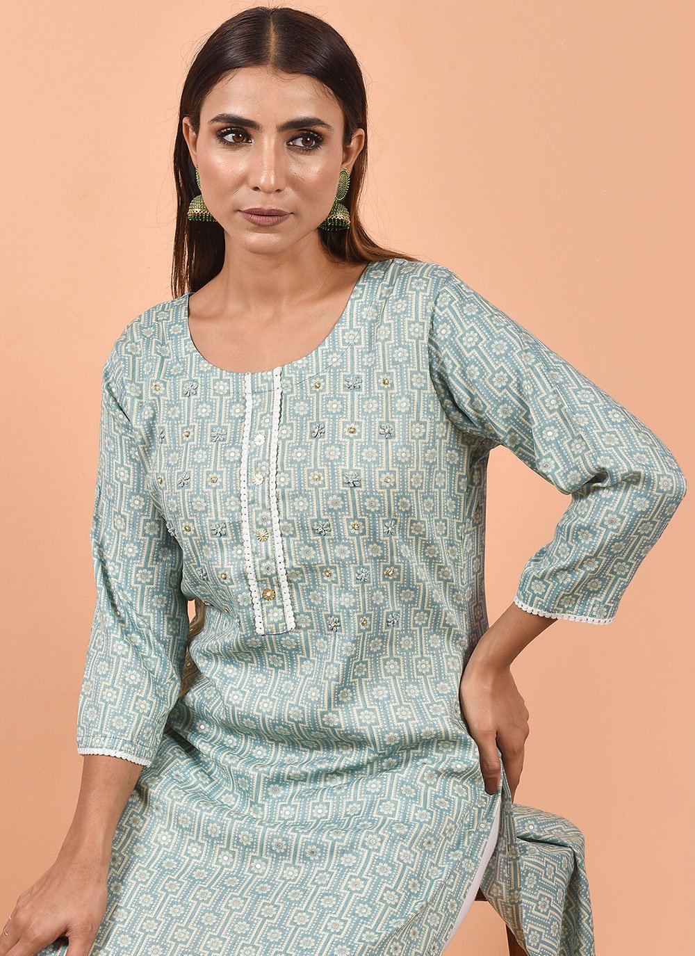 Be your own vogue icon with blue cotton party wear kurti. The appealing printed work a intensive characteristic of this attire. (Slight variation in color, fabric & work is possible. Model images are only representative.)