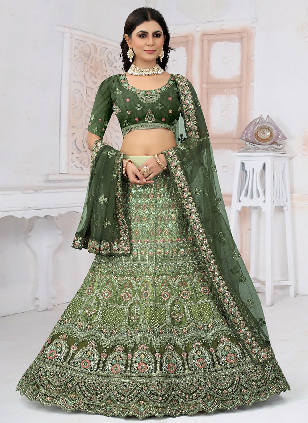 Bring out the true diva in you and reinvent your true self. All of this accenting the feminine beauty, with this green net readymade lehenga choli. The embroidered, resham and zari work looks chic and perfect for any occasion. Comes with matching choli and dupatta. (Slight variation in color, fabric & work is possible. Model images are only representative.)