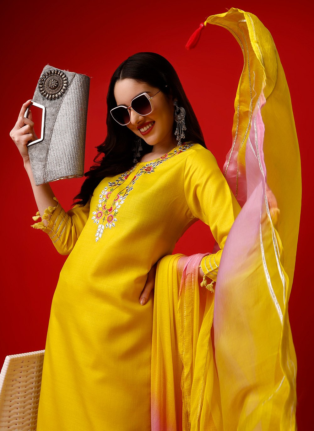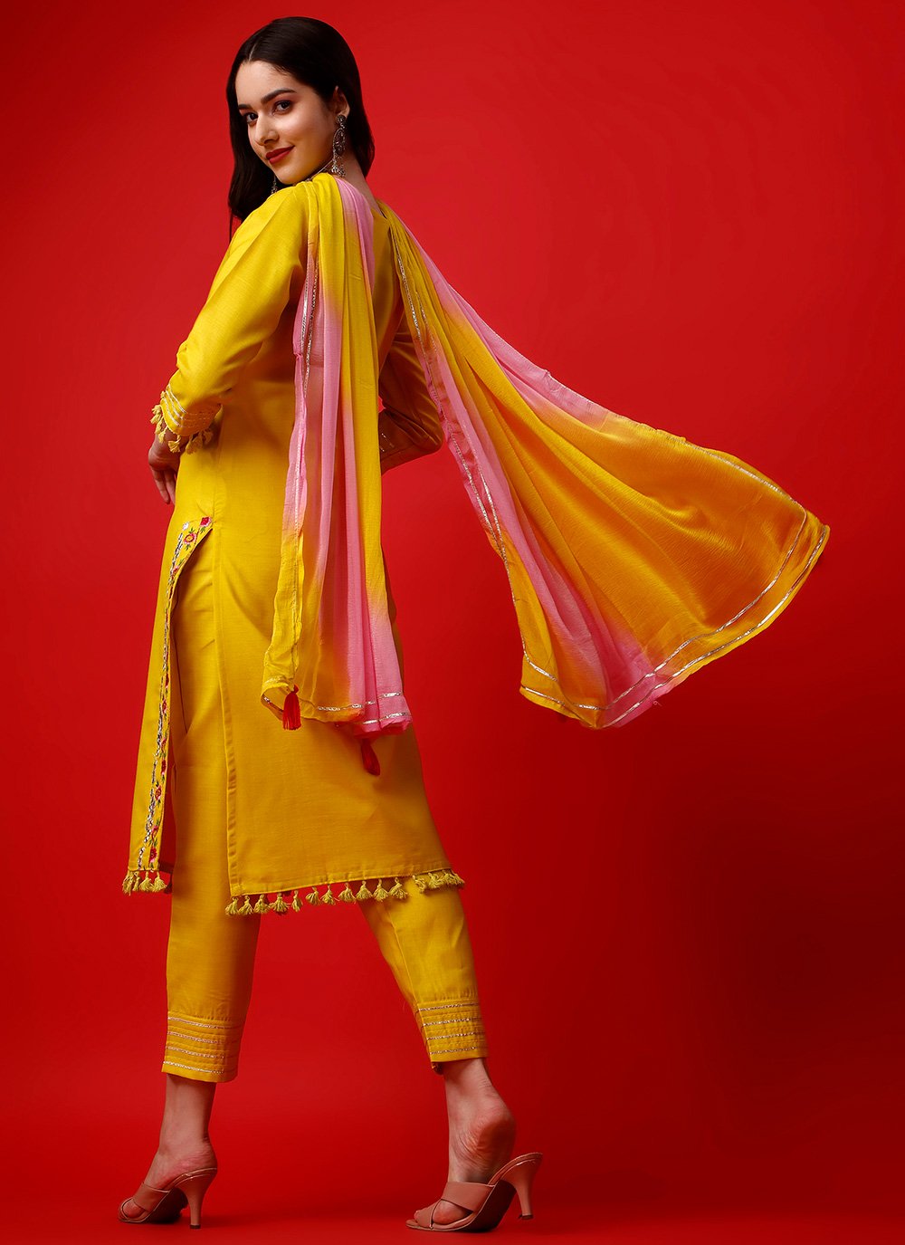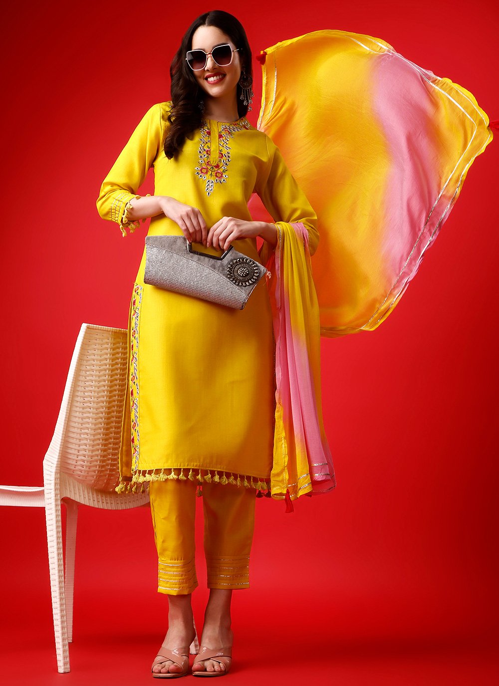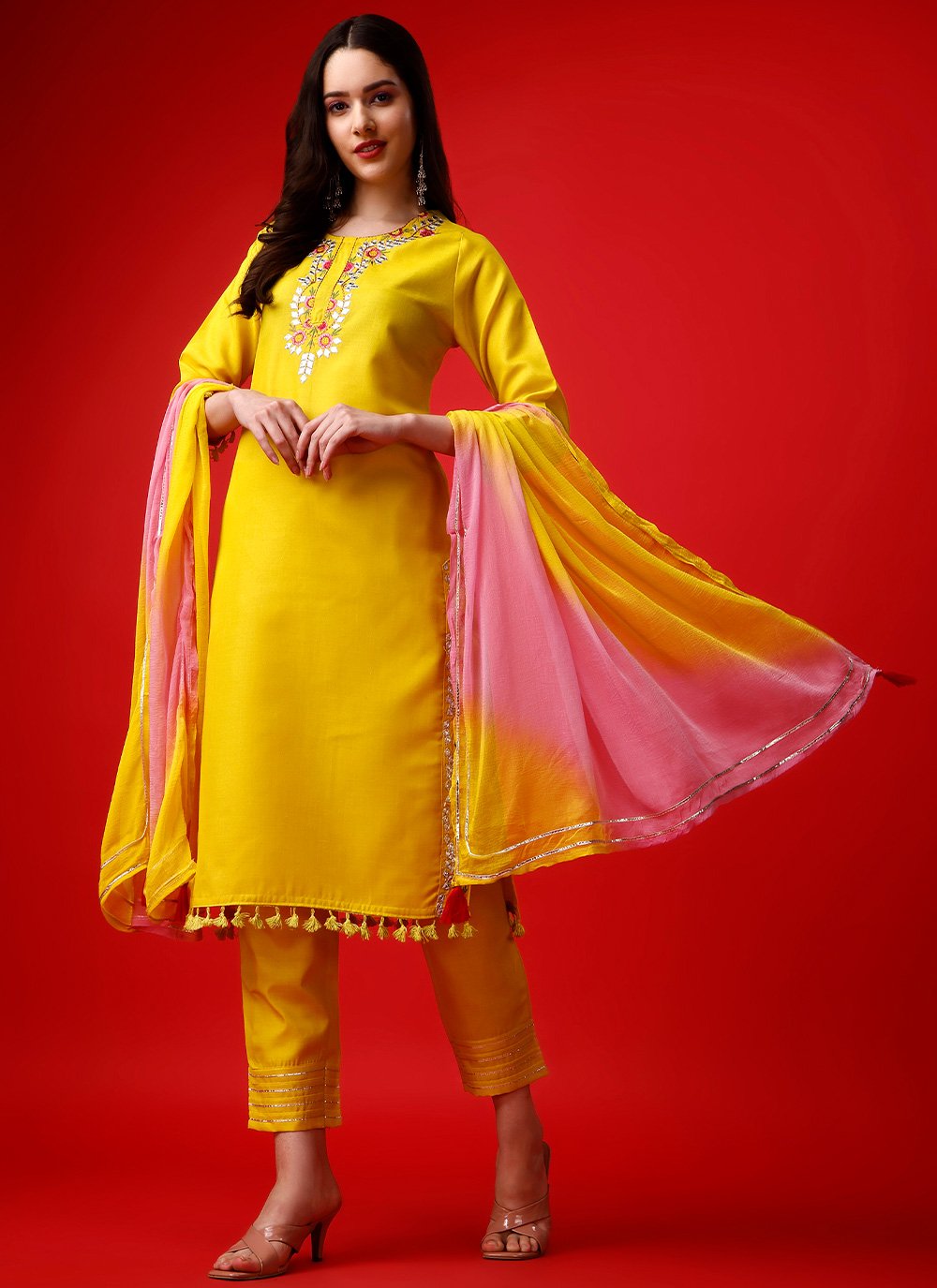 Genuine elegance can come out from your dressing style with this yellow rayon readymade style. The lovely embroidered work in the course of the dress is awe inspiring. Comes with matching bottom and dupatta. (Slight variation in color, fabric & work is possible. Model images are only representative.) Maximum possible bust size: 42 inches.