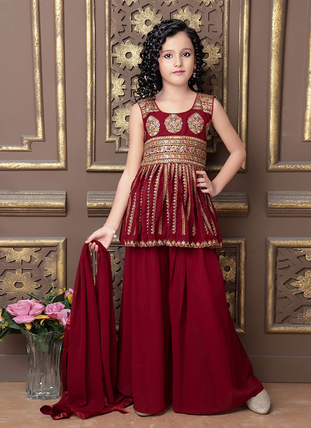 Salwar Suit Faux Georgette Maroon Embroidered Kids