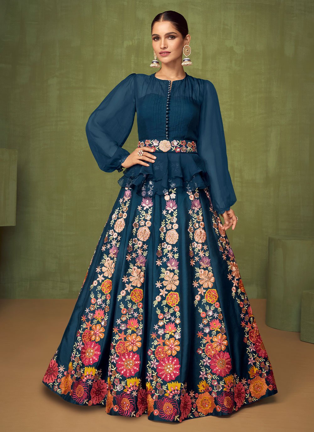 Be the sunshine of everybody’s eyes dressed with this navy blue georgette salwar kameez. You will see some intriguing patterns done with embroidered work. Comes with matching bottom and dupatta. (Slight variation in color, fabric & work is possible. Model images are only representative.) Maximum possible bust size: 42 inches.