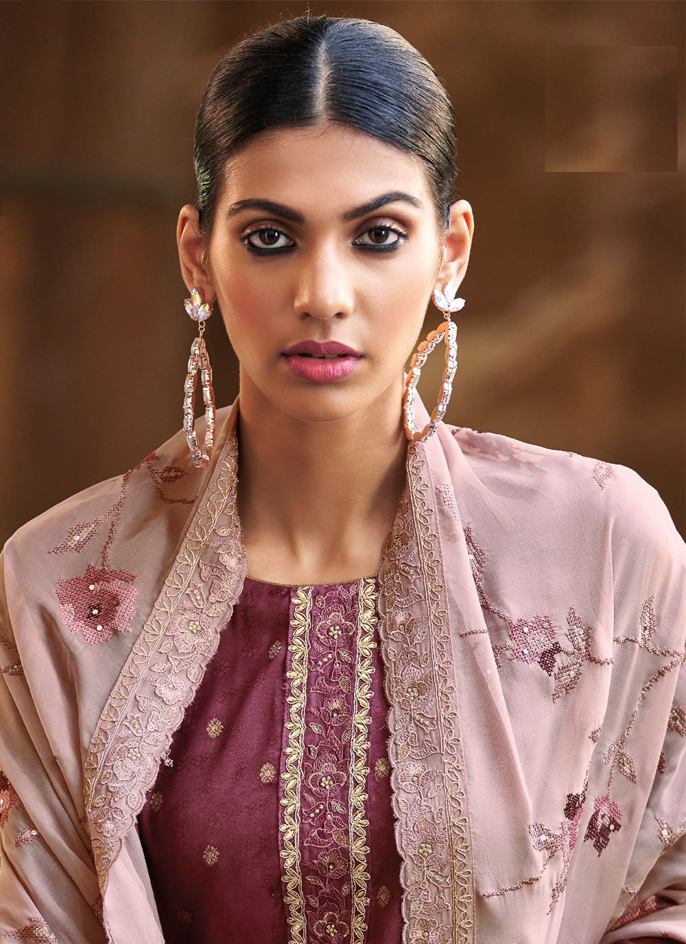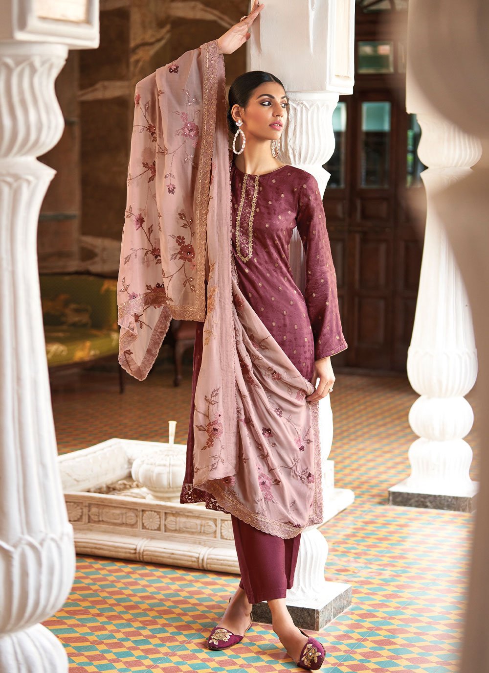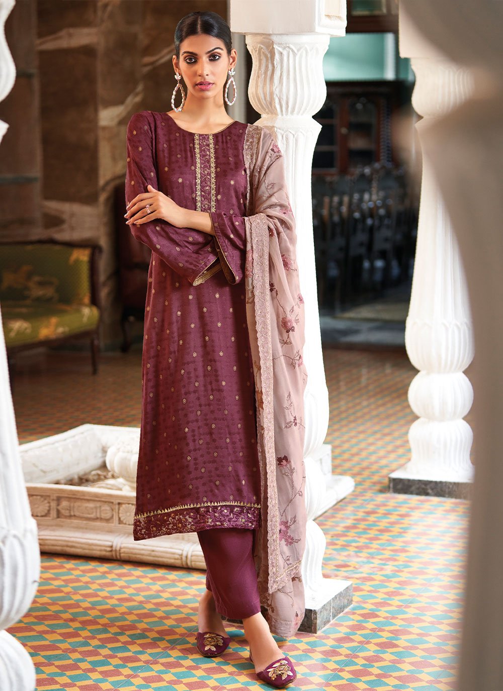Be the sunshine of everyone’s eyes dressed in such a desirable purple jacquard salwar suit. The embroidered work appears chic and aspiration for sangeet. Comes with matching bottom and dupatta. (Slight variation in color, fabric & work is possible. Model images are only representative.) Maximum possible bust size: 42 inches.