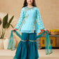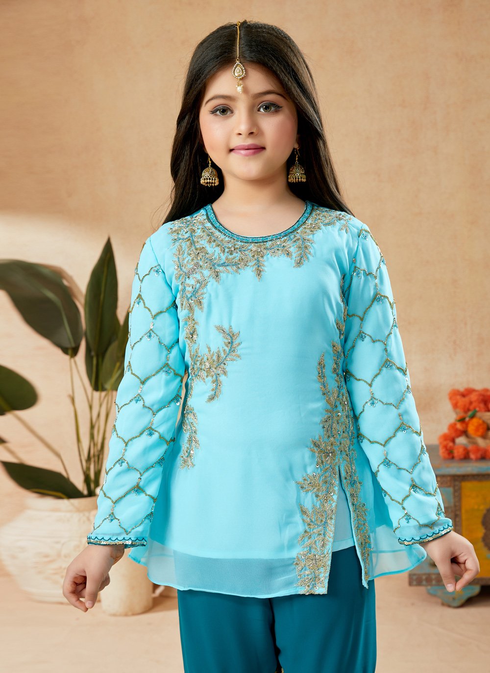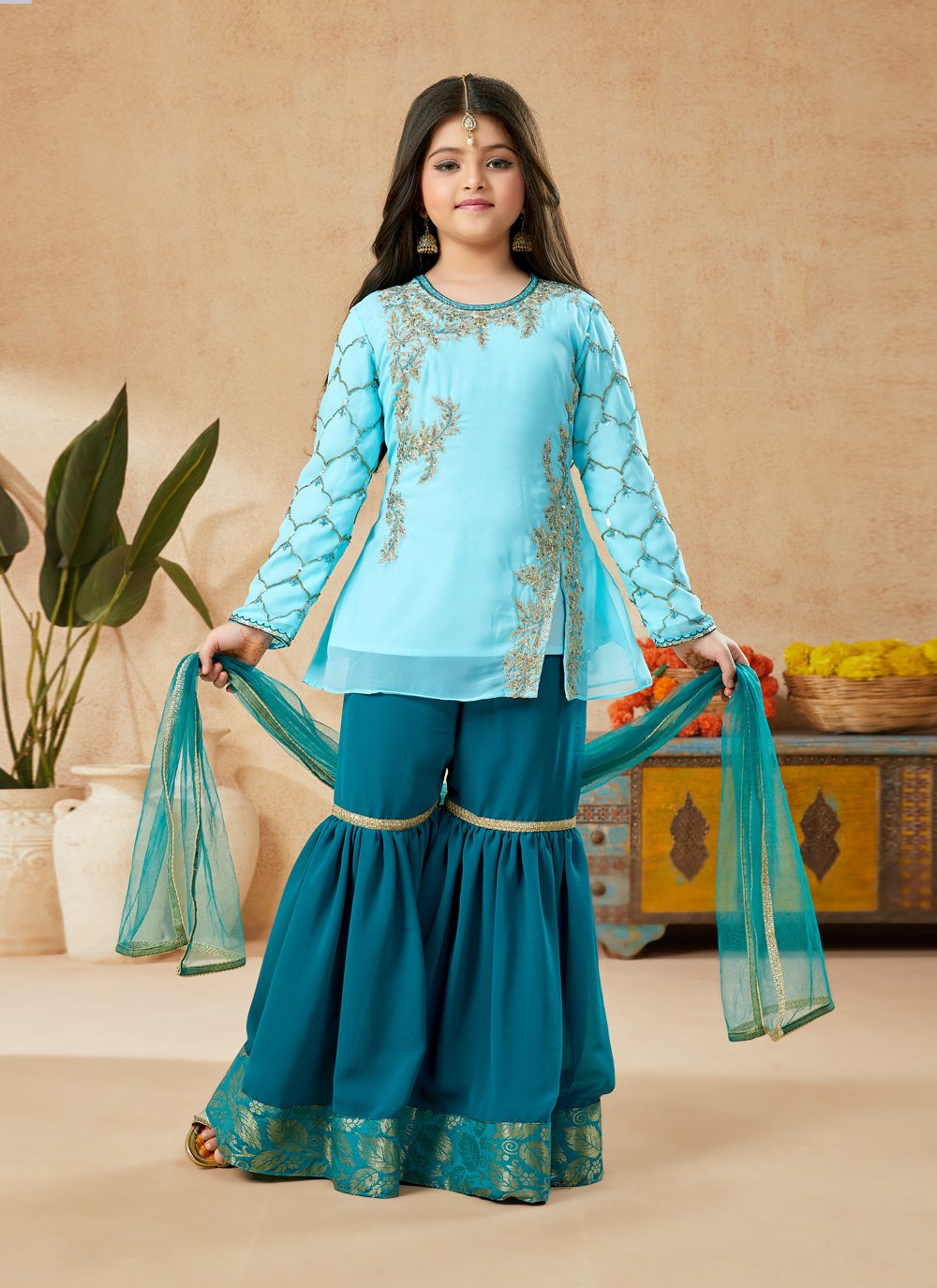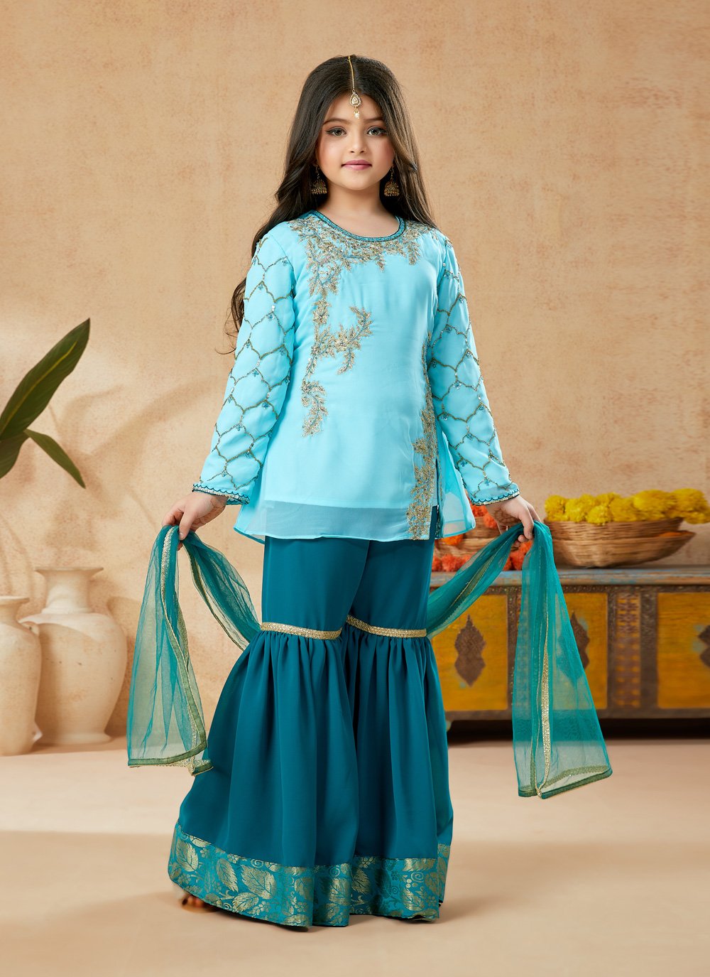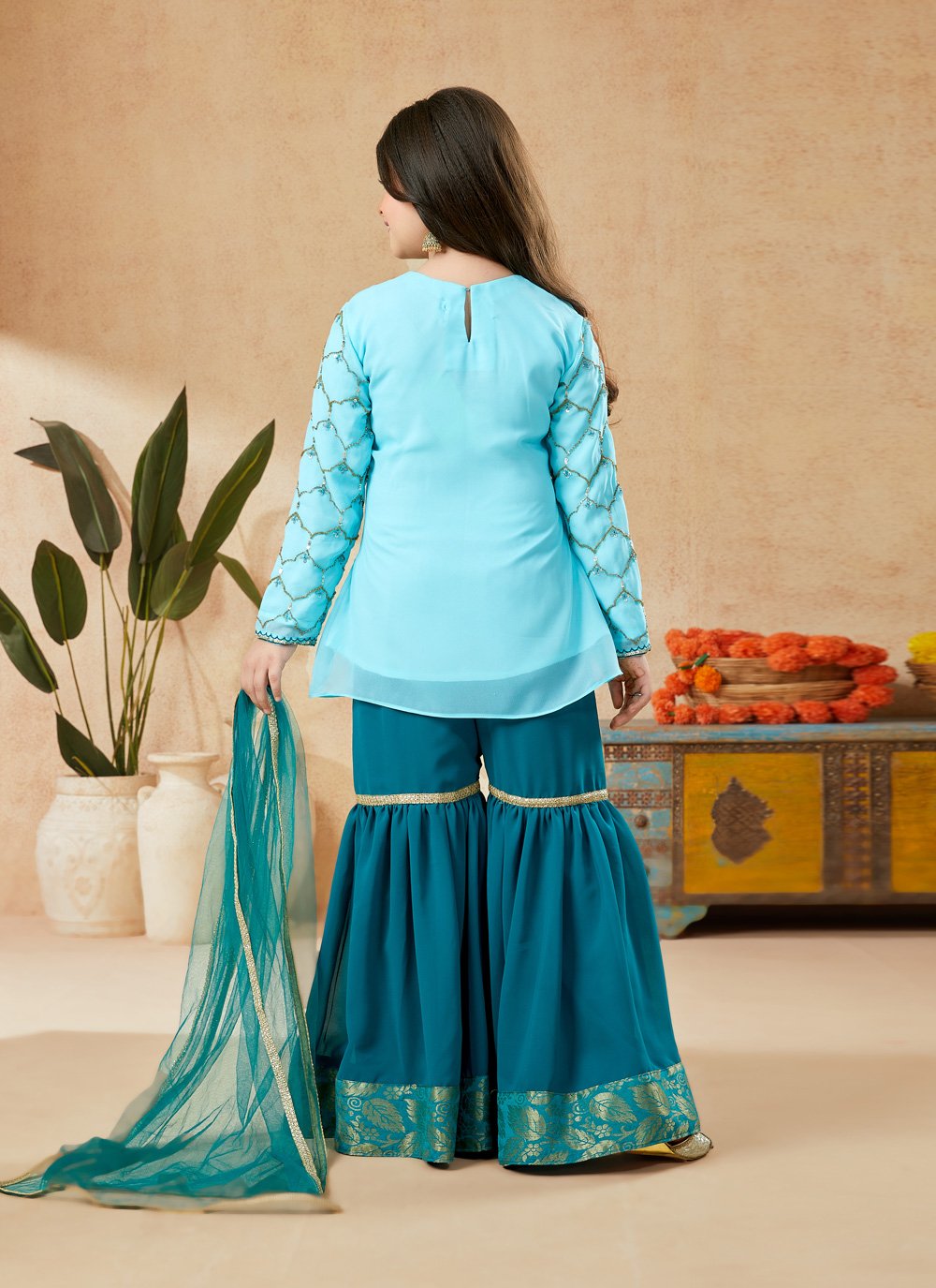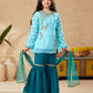 Sharara Set Faux Georgette Turquoise Embroidered Kids