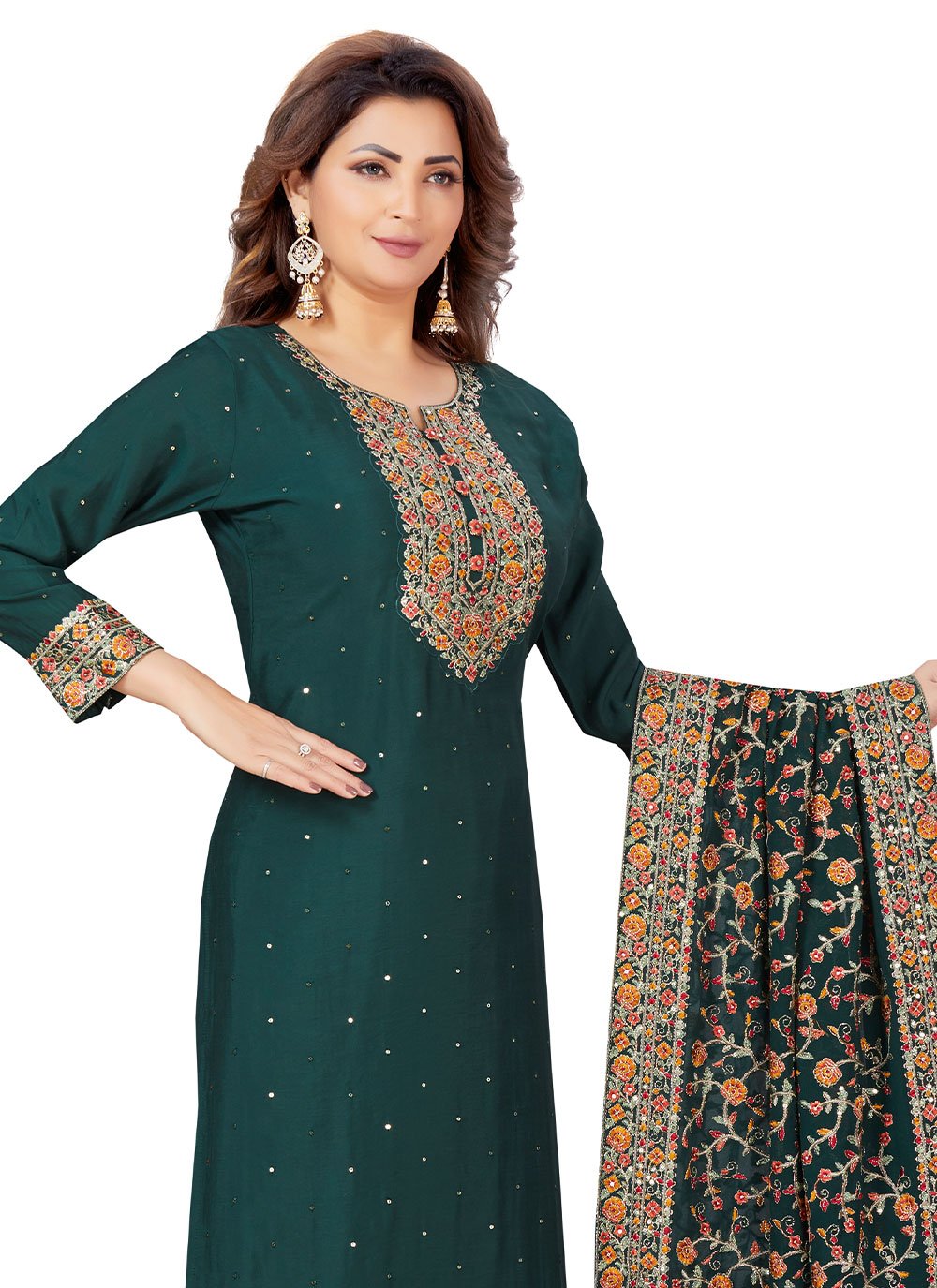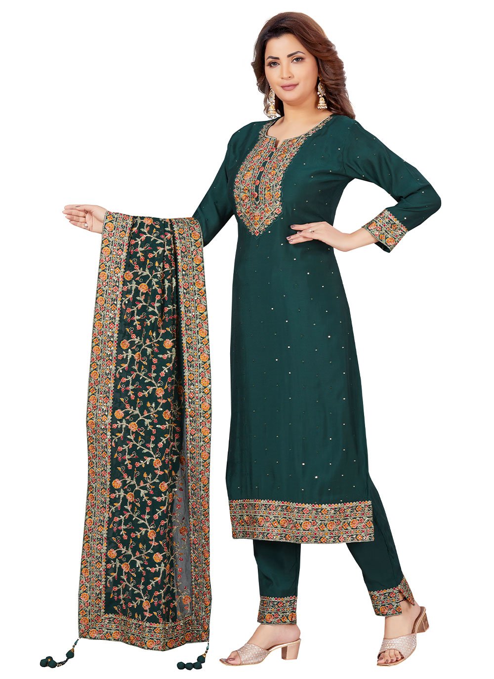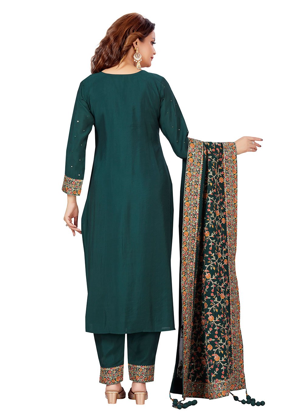 Straight Salwar Suit Chanderi Green Embroidered Salwar Kameez