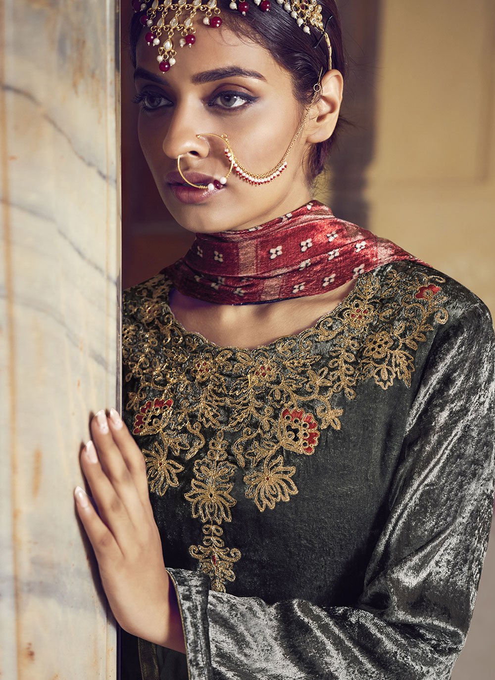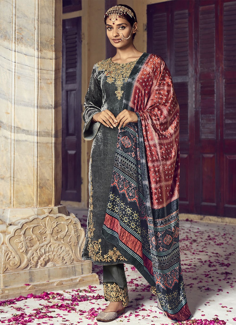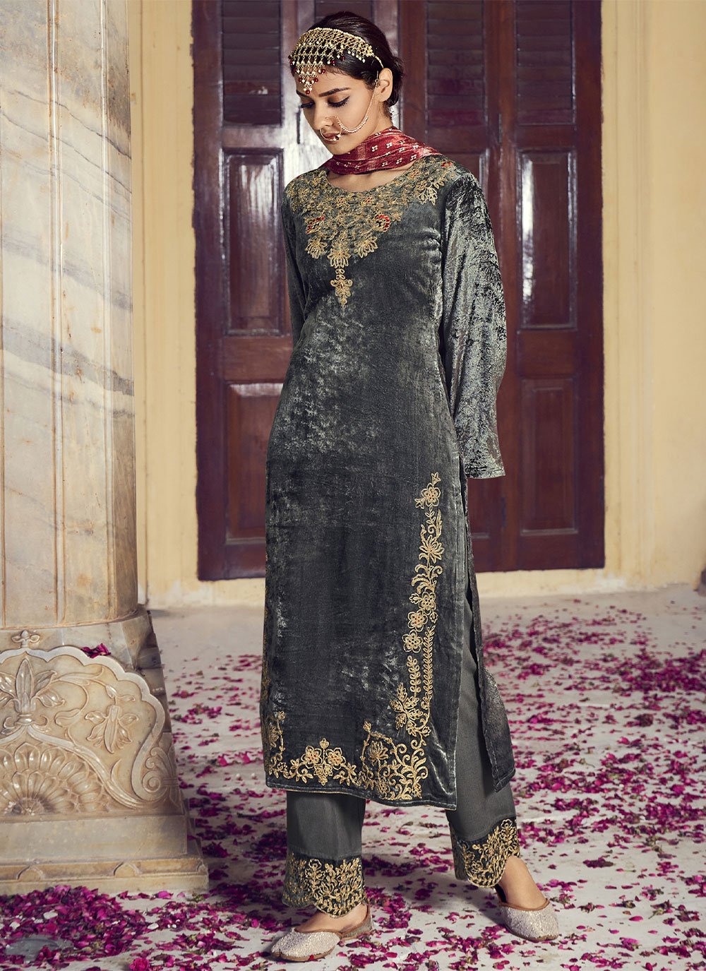 An remarkable grey velvet straight salwar suit will make you look quite stylish and graceful. The brilliant attire creates a dramatic canvas with incredible embroidered work. Comes with matching bottom and dupatta. (Slight variation in color, fabric & work is possible. Model images are only representative.) Maximum possible bust size: 42 inches.