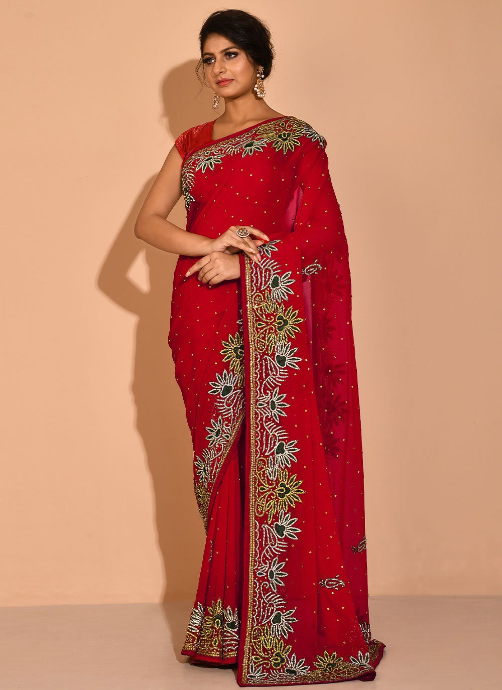 We have ensemble a symphony of enchanting piece to restyle your senses. Be an angel and create a smashing impression on anyone by carrying this red georgette traditional designer saree. The amazing attire creates a dramatic canvas with fantastic embroidered and handwork work. Comes with matching blouse. (Slight variation in color, fabric & work is possible. Model images are only representative.)