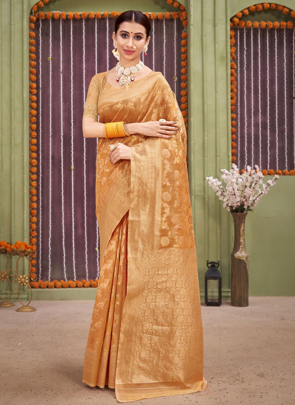 You will be bound to make a powerful style statement with this mustard linen designer traditional saree. The ethnic foil print work for the attire adds a sign of beauty statement to your look. Comes with matching blouse. (Slight variation in color, fabric & work is possible. Model images are only representative.)