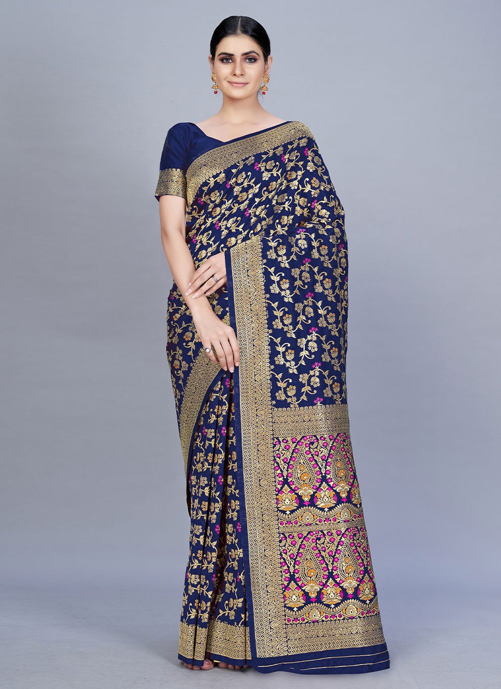 Design and style and trend would be at the peak of your attractiveness the moment you attire this navy blue banarasi silk trendy saree. The enticing woven work a substantial element of this attire. Comes with matching blouse. (Slight variation in color, fabric & work is possible. Model images are only representative.)