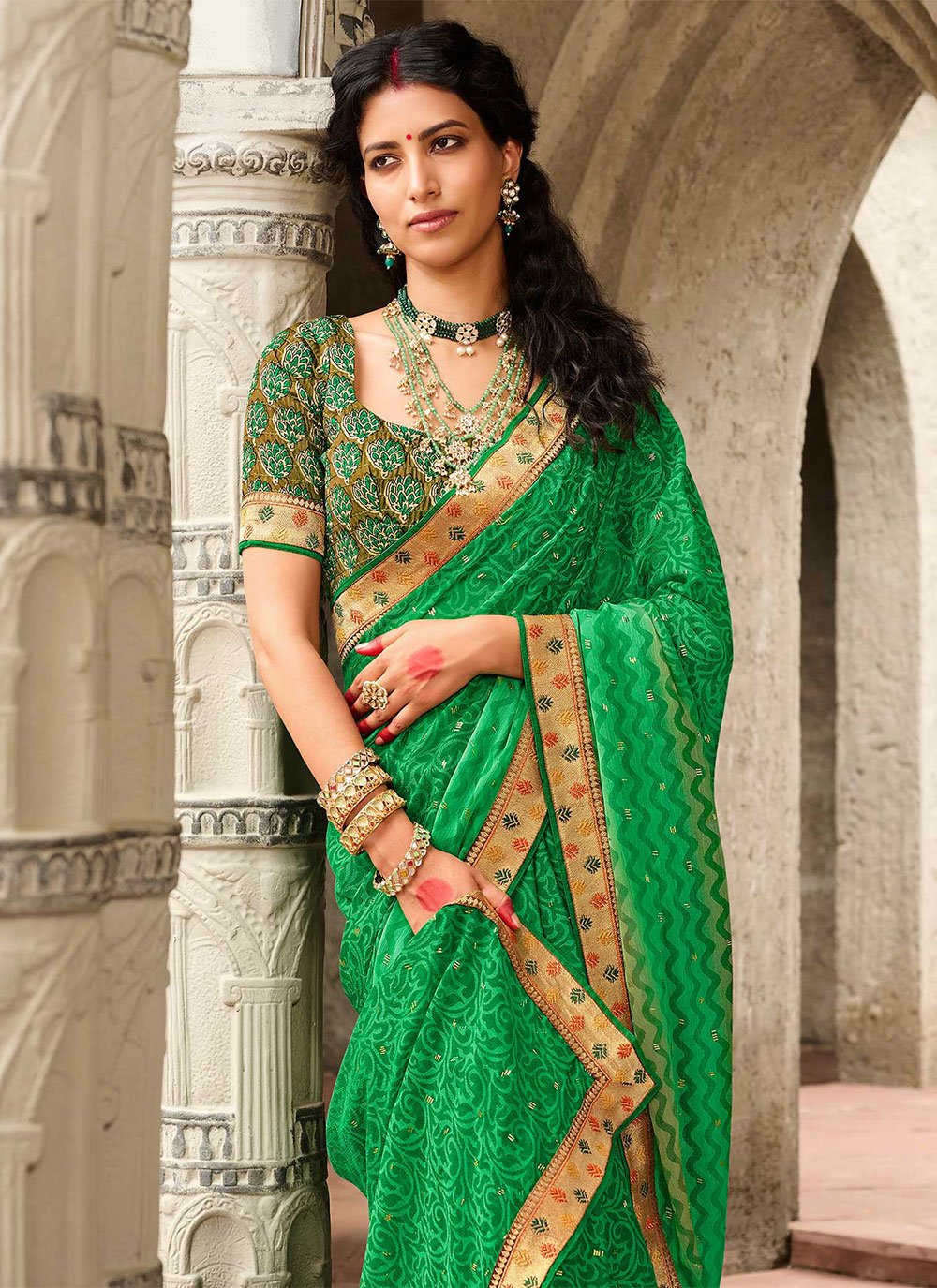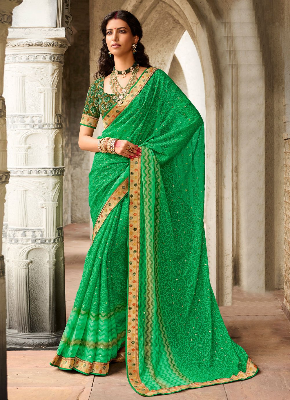 Precise attractiveness will come out through the dressing trend with this green brasso trendy saree. The pretty printed work all through the dress is awe inspiring. Comes with matching blouse. (Slight variation in color, fabric & work is possible. Model images are only representative.)