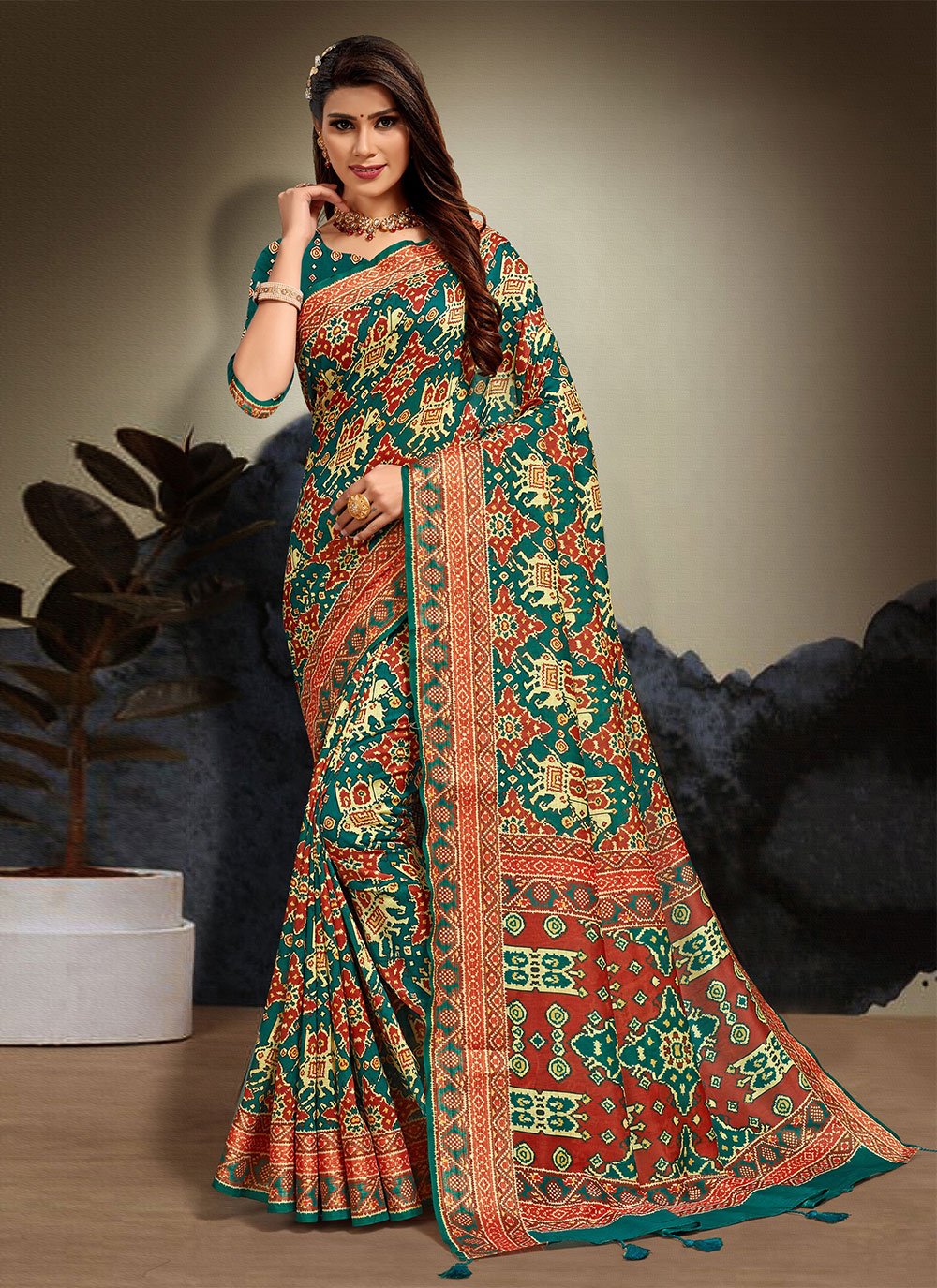 Its a master piece in its class glorifying your timeless beauty. Be ready to slip in the comfort zone of green cotton trendy saree. The lovely printed work throughout the attire is awe inspiring. Comes with matching blouse. (Slight variation in color, fabric & work is possible. Model images are only representative.)