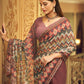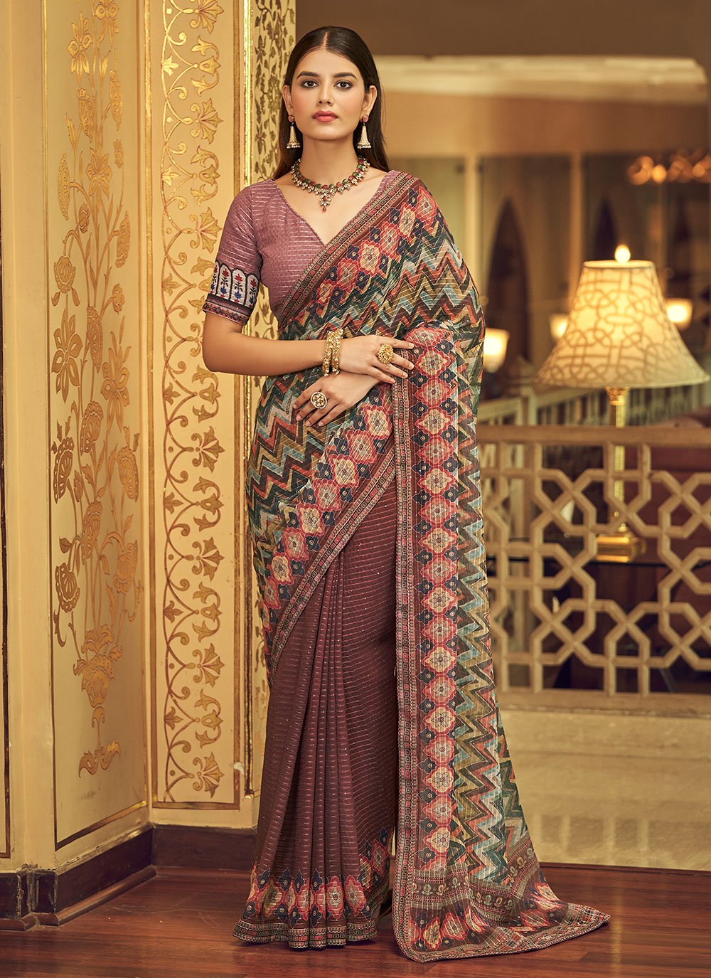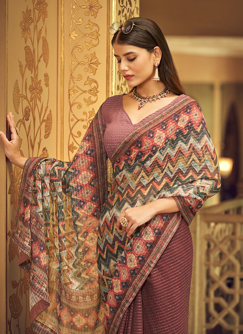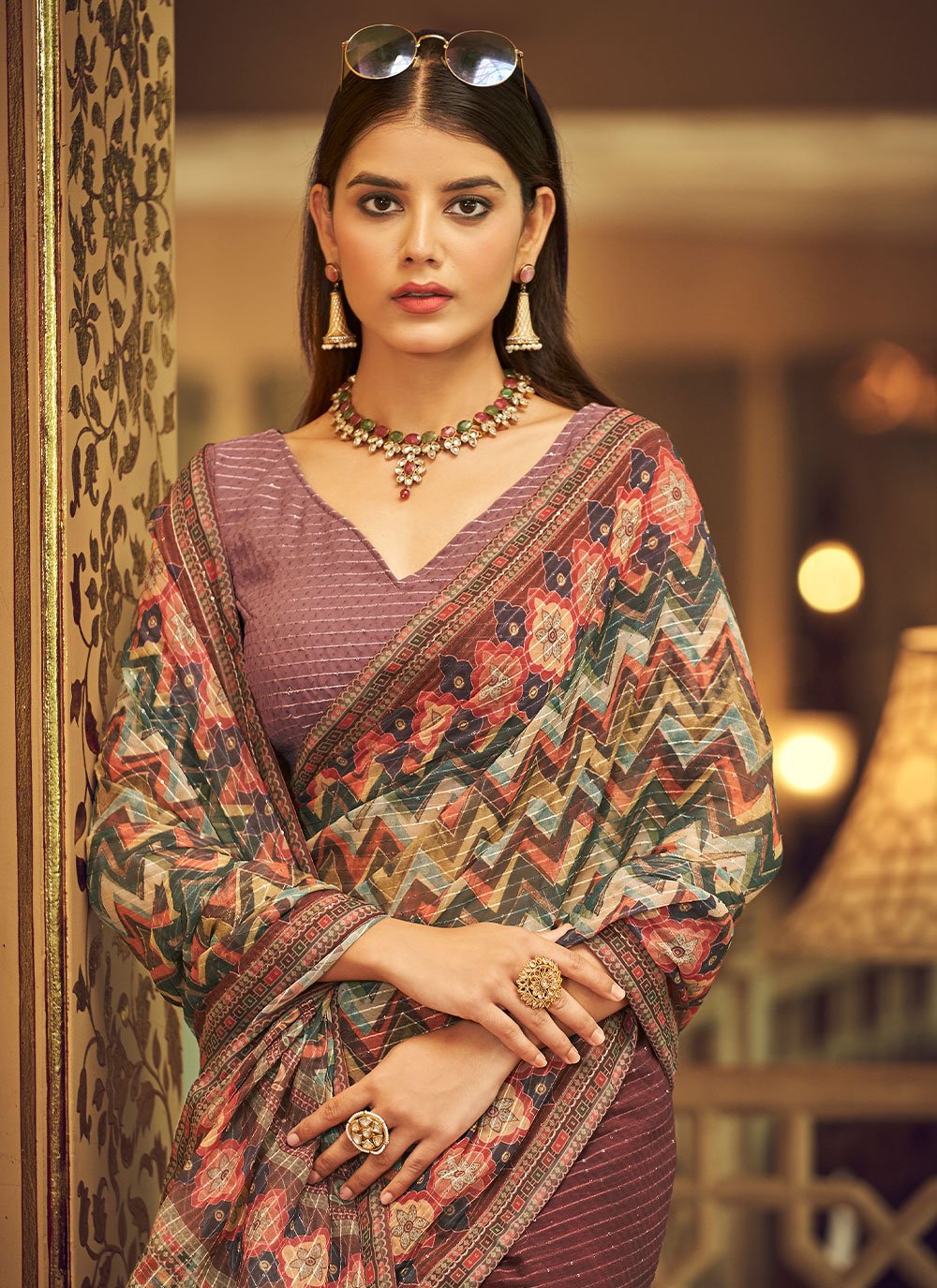 Famous designers tend to give reign to their imagination and create clothes that look interesting and guided by the desire to attract attention. Look stunningly beautiful in this beige georgette trendy saree. It has been beautifully designed with print, sequins and thread work. Comes with matching blouse. (Slight variation in color, fabric & work is possible. Model images are only representative.)