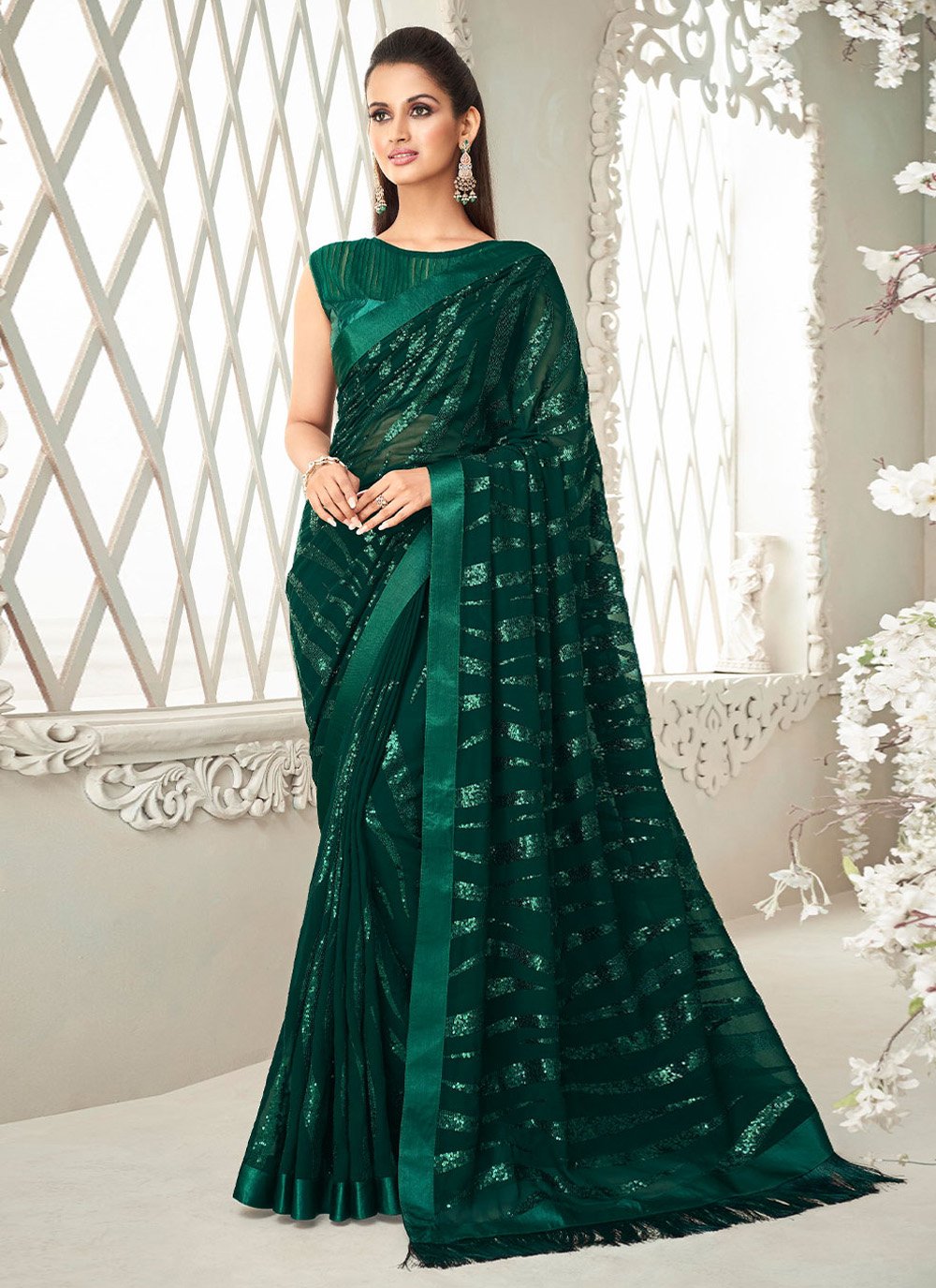 Design and pattern could be at the peak of your beauty after you dresses this green georgette trendy saree. The ethnic fancy work with a dress adds a sign of magnificence statement for the look. Comes with matching blouse. (Slight variation in color, fabric & work is possible. Model images are only representative.)