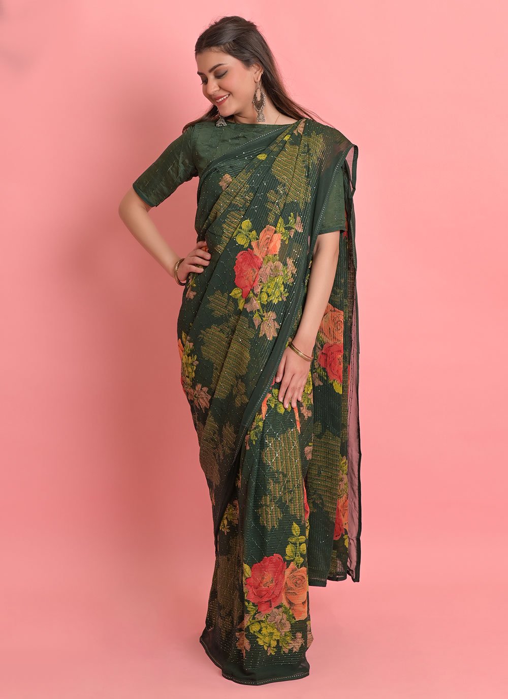 You look so charming wearing this attire. Make the heads flip whenever you costume up in this kind of a attractive green georgette trendy saree. The fantastic attire creates a dramatic canvas with fantastic floral print, sequins and stone work. Comes with matching blouse. (Slight variation in color, fabric & work is possible. Model images are only representative.)