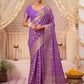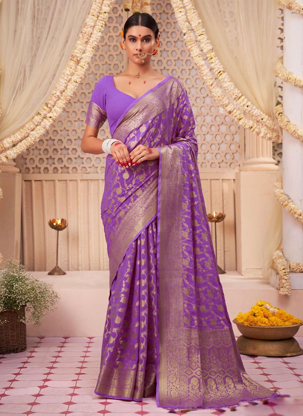Unique splendor comes out from your dressing style and design with this purple georgette trendy saree. This engaging attire is showing some superb embroidery done with weaving work. Comes with matching blouse. (Slight variation in color, fabric & work is possible. Model images are only representative.)