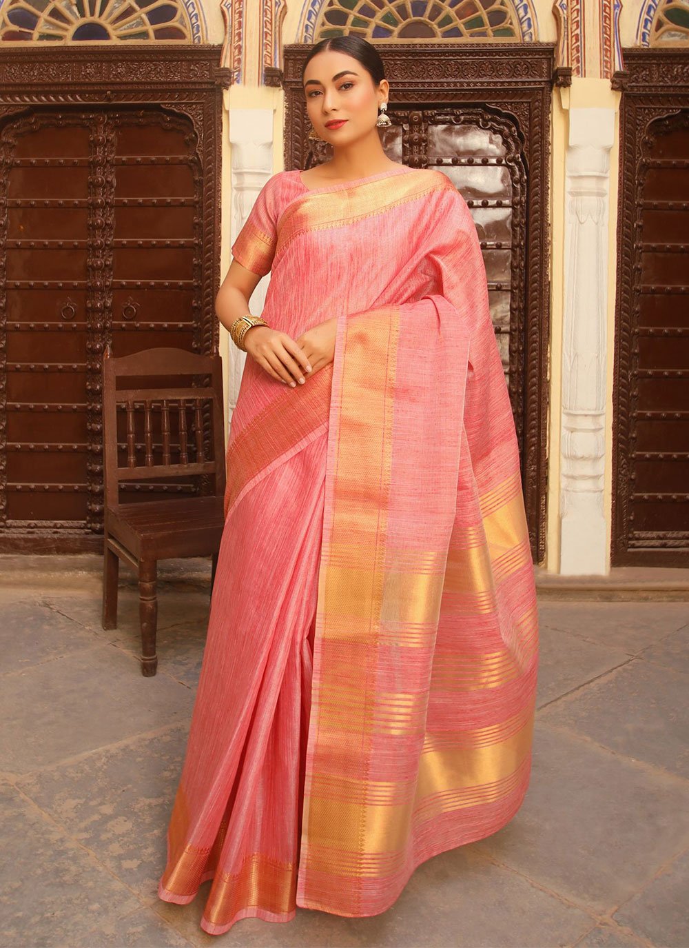 Designed with simplicity with a touch of soberness in its work makes a masterpiece. Keep ahead in fashion with this pink linen and silk trendy saree. Beautified with woven work all synchronized well with the pattern and design of the attire. Comes with matching blouse. (Slight variation in color, fabric & work is possible. Model images are only representative.)