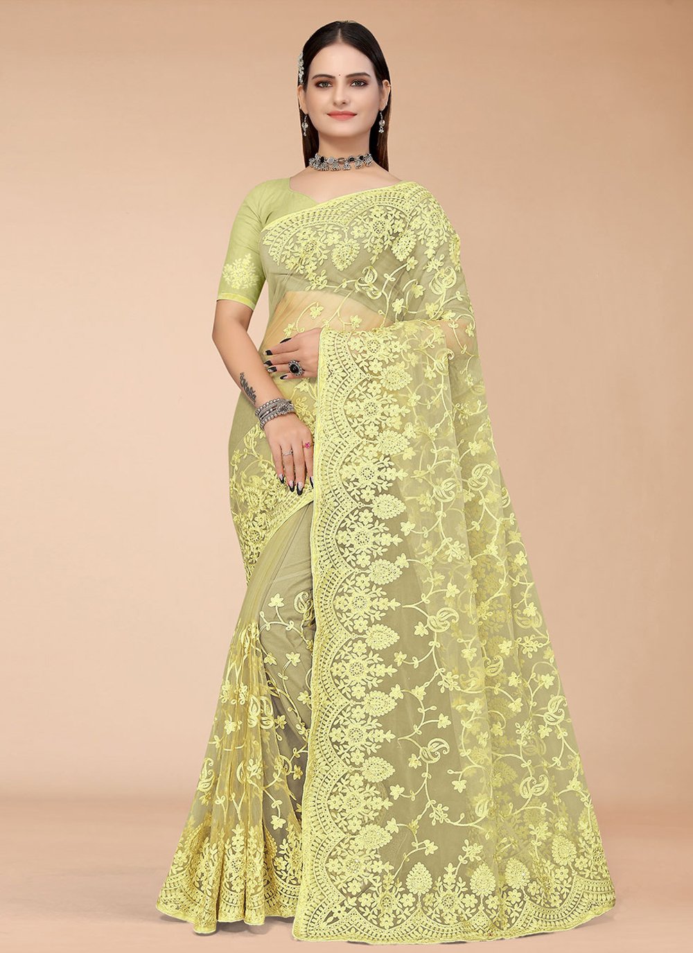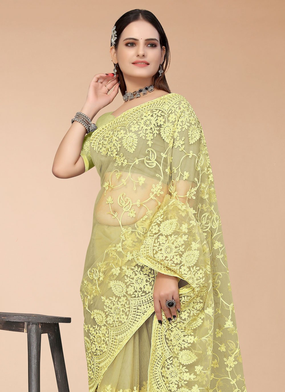 Designed with simplicity with a touch of soberness in its work makes a masterpiece. This green net trendy saree add the sense of elegant and glamorous. The brilliant attire creates a dramatic canvas with amazing embroidered work. Comes with matching blouse. (Slight variation in color, fabric & work is possible. Model images are only representative.)