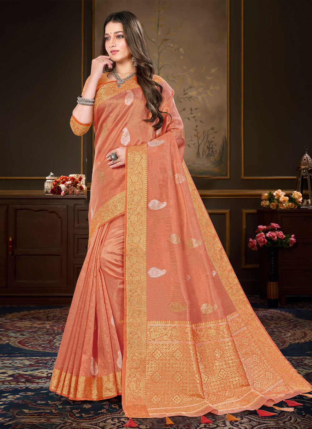 This brilliant array will make you the ultimate classic beauty at the next event you attend. Look ethnic in this affluent orange organza trendy saree. Beautified and stylized with weaving work to give you an attractive look. Comes with matching blouse. (Slight variation in color, fabric & work is possible. Model images are only representative.)