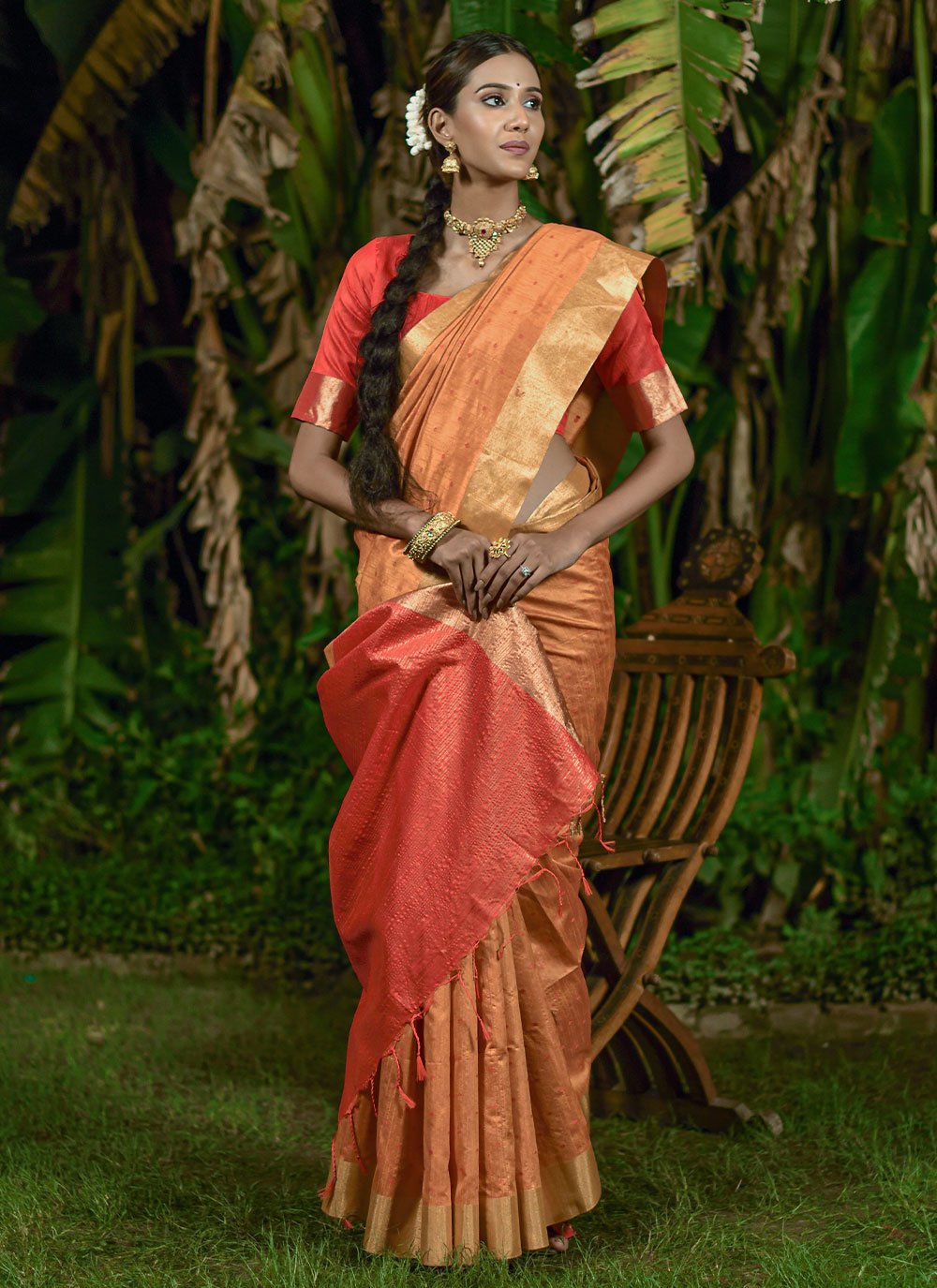 If you are a diva who loves to turn heads wherever you go and this delightful drape is a must have item for your closet. Get the simplicity and grace with this orange raw silk trendy saree. This lovely attire is looking extra beautiful with embelishment of woven work. Comes with matching blouse. (Slight variation in color, fabric & work is possible. Model images are only representative.)