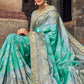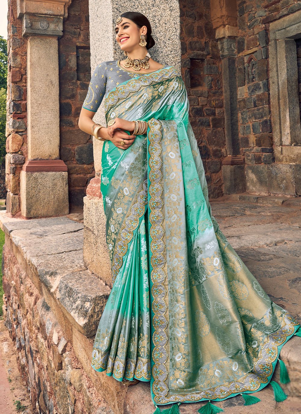 Aspiring to make a mark in the world of style, here is the attire to breath life into your aspirations. Make the heads flip after you dress up with this gorgeous green silk trendy saree. The stunning weaving work throughout the attire is awe inspiring. Comes with matching blouse. (Slight variation in color, fabric & work is possible. Model images are only representative.)