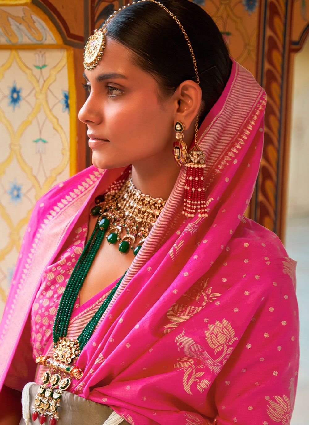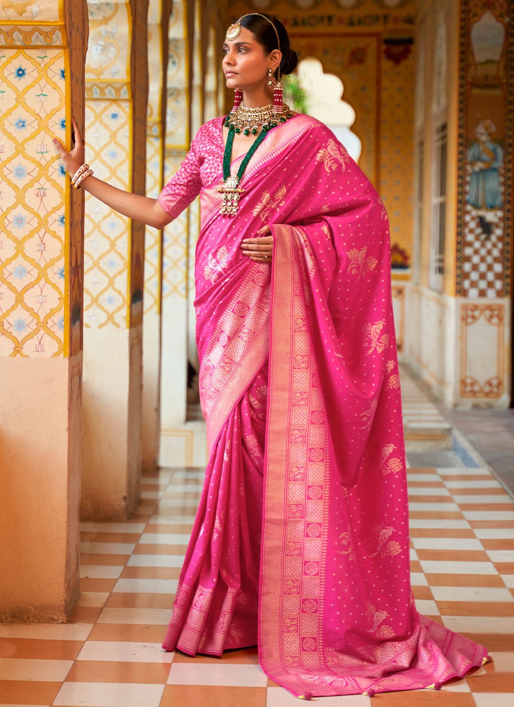 Be an angel and create and establish a smashing influence on anybody by carrying this pink silk trendy saree. The ethnic foil print work over a attire adds a sign of elegance statement for your look. Comes with matching blouse. (Slight variation in color, fabric & work is possible. Model images are only representative.)