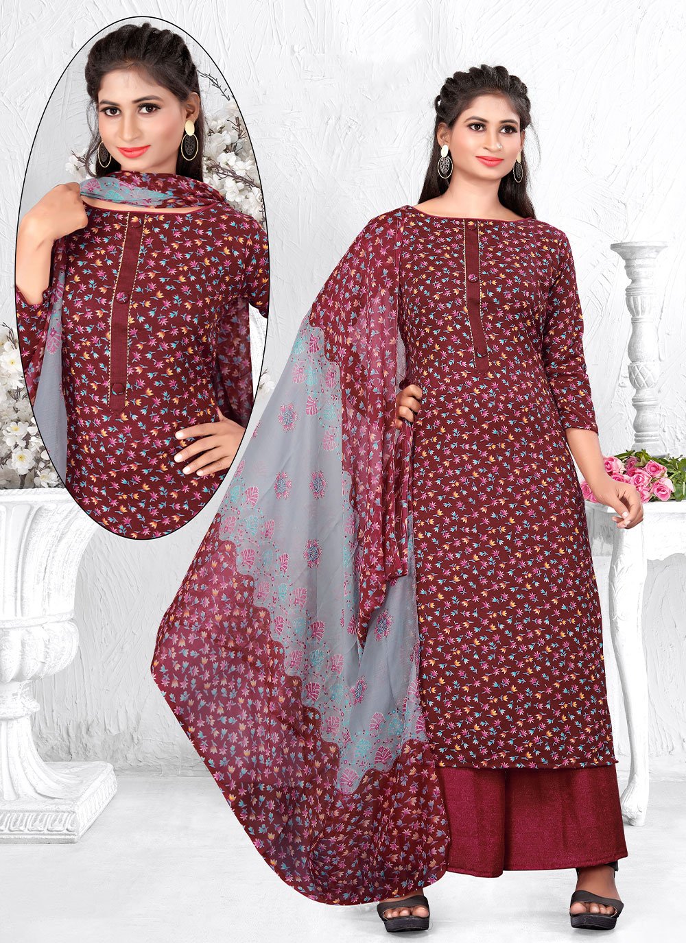 Real elegance will come out of your dressing style with this maroon cotton trendy salwar suit. The desirable printed work a vital attribute of this dress. Comes with matching bottom and dupatta. (Slight variation in color, fabric & work is possible. Model images are only representative.) Maximum possible bust size: 42 inches.
